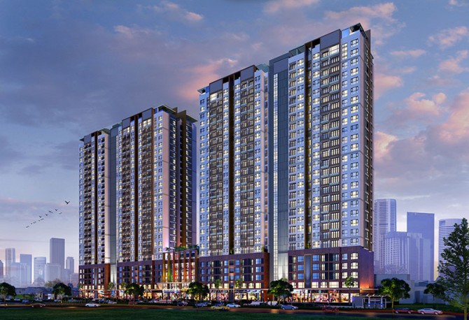Căn hộ gồm 2 Block, quy mô 500 căn hộ, bao gồm tầng trung tâm thương mại, hồ bơi, trường mầm non.