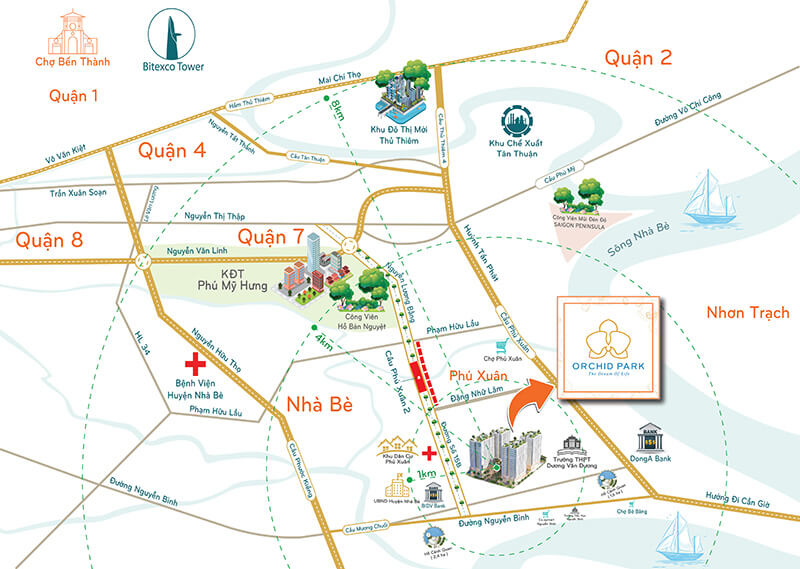 Orchid Park Nhà Bè sở hữu vị trí đắc địa trên thị trường căn hộ hiện nay khi kết nối đến trung tâm thành phố, khu đô thị sầm uất Phú Mỹ Hưng quận 7, quận 4,... nhanh chóng thông qua đường 15B Nguyễn Lương Bằng nối dài lộ giới 40m và trục đường Huỳnh Tấn Phát sắp được nâng cấp, mở rộng.