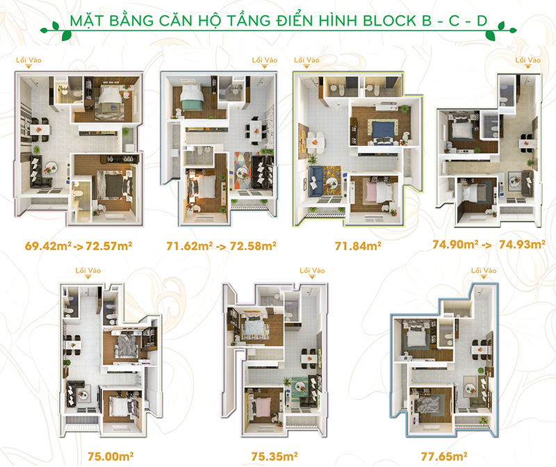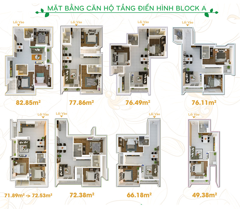 - Diện tích căn hộ từ 49m2 - 81m2 có từ 1 - 3 phòng ngủ.