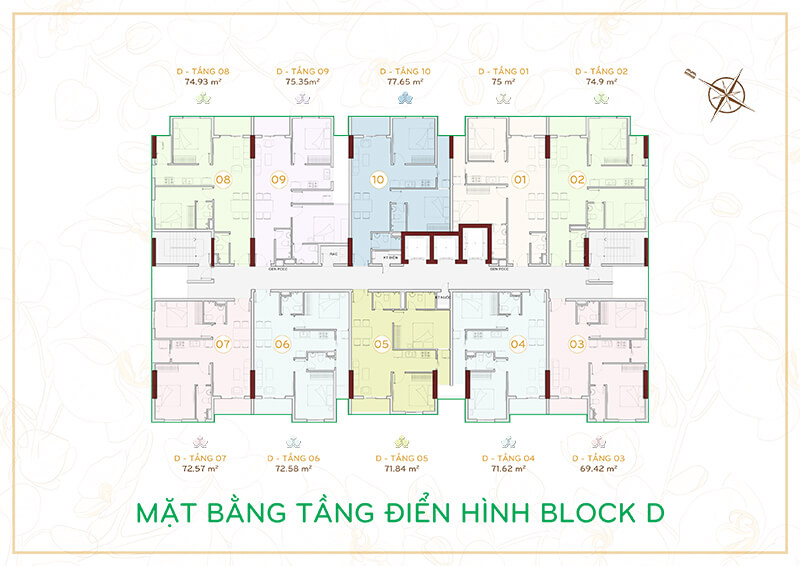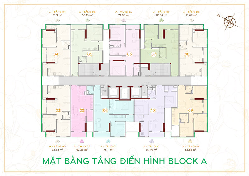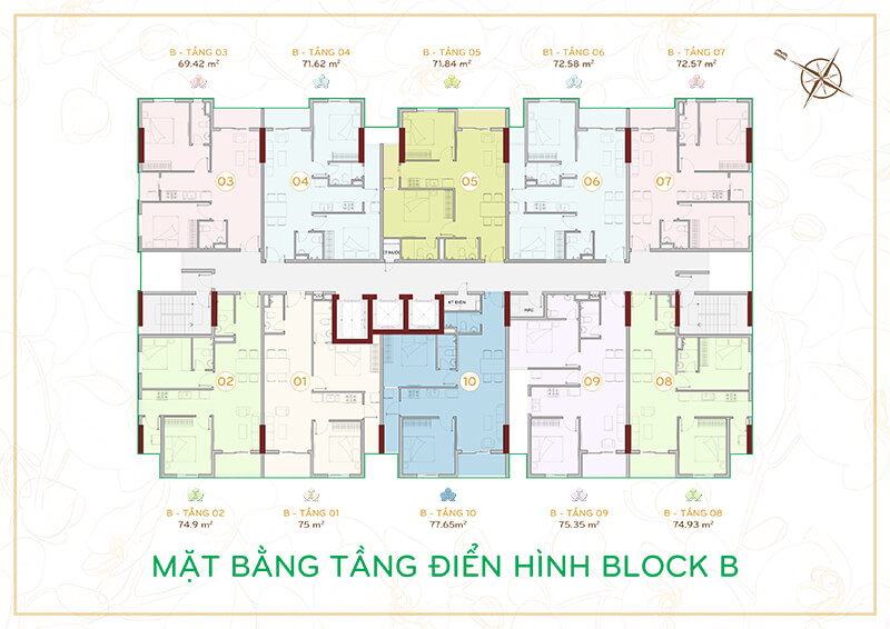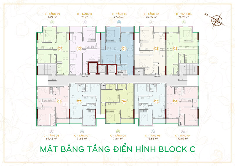 - Tầng 1 là trung tâm thương mại, phòng sinh hoạt cộng đồng và nhà trẻ, tầng 2,3 để xe, từ tầng 4 đến tầng 17 là căn hộ ở.